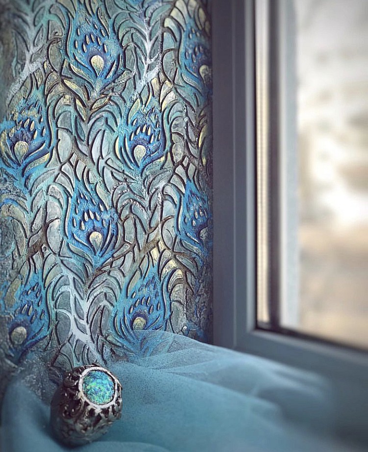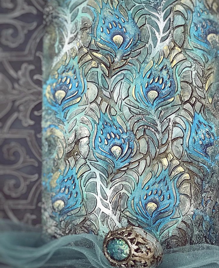 Роскошный трафарет под штукатурку с перьями павлина без полей.